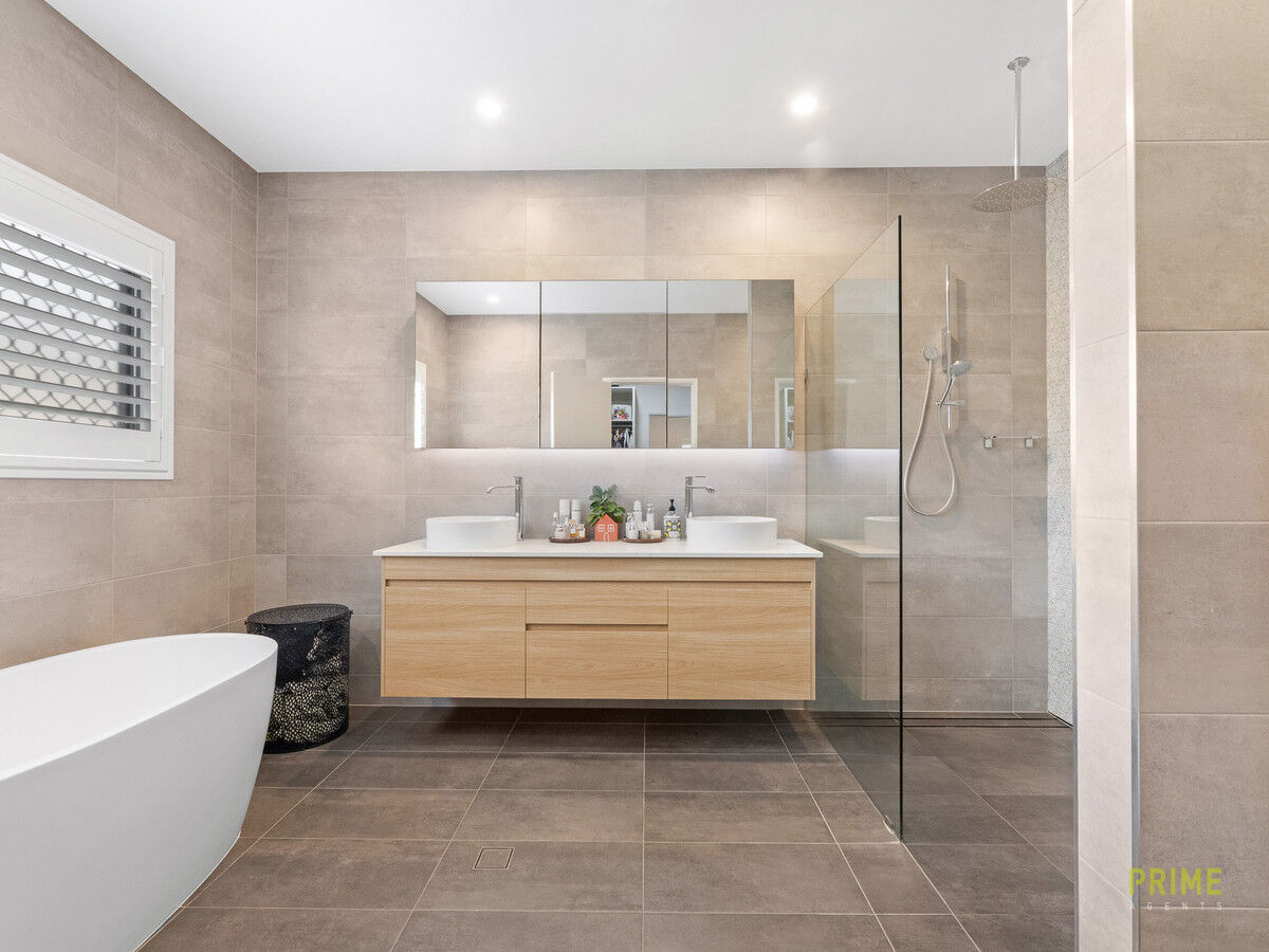 • Ensuite with double vanity, stone benchtops, freestanding bath and dual rainfall showerheads + separate handheld