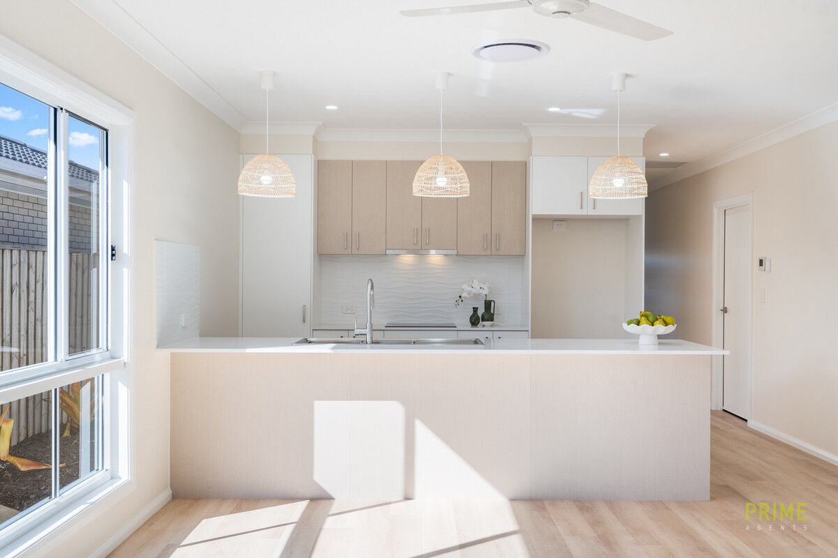 Step inside to discover the effortless open-plan living, flowing seamlessly through sliding glass doors onto a covered outdoor entertaining area – creating the perfect space for relaxed gatherings. The modern kitchen is the heart of the home, complete with sleek finishes and a contemporary backsplash to satisfy every home chef.